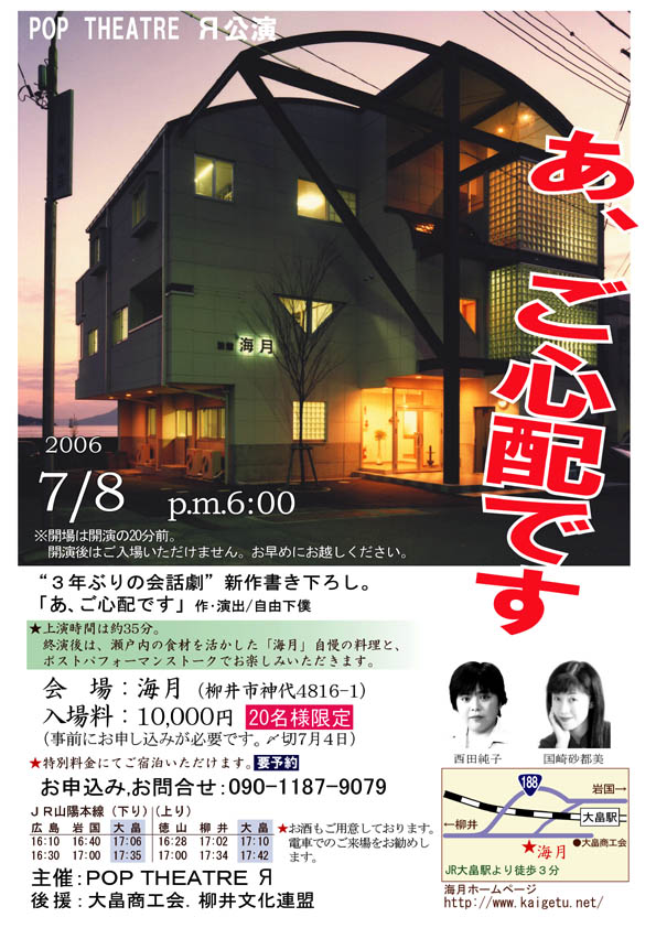 | 2006年7月 | 「あ、ご心配です」(作・演出/自由下僕) チラシ 記事 1 ・ 2 ・ 3 ・ 4 ・ 5 詳細 |