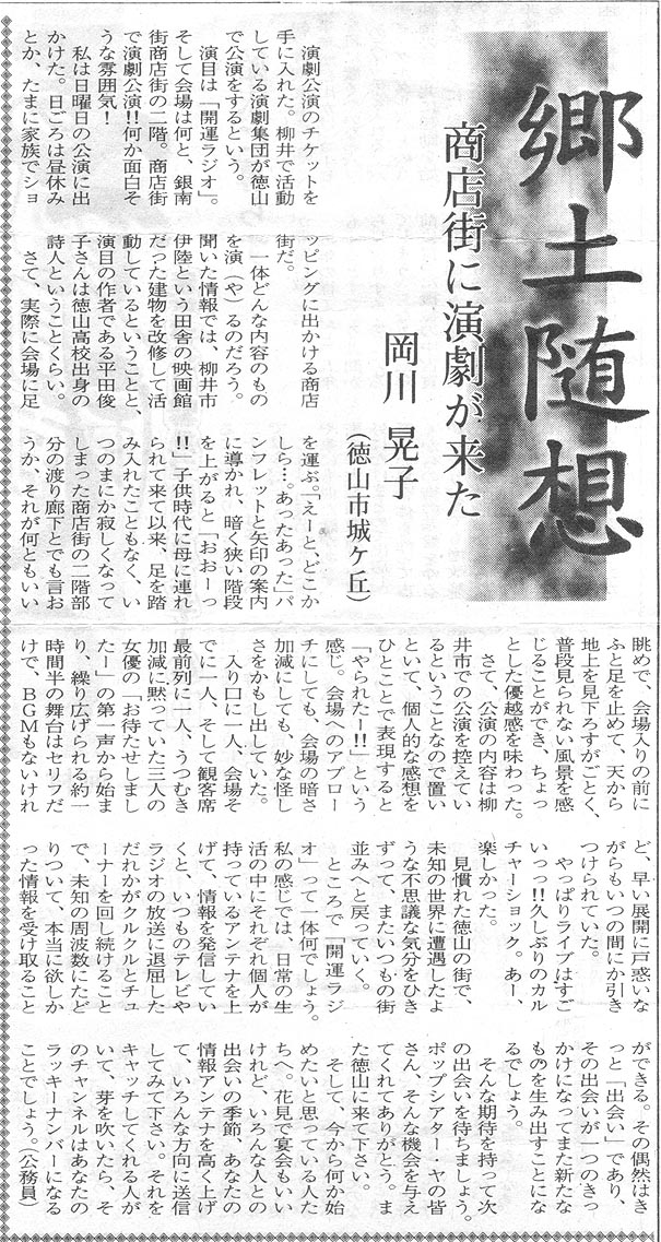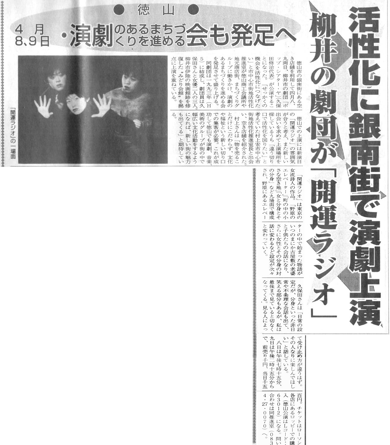 | 同 | 「開運ラジオ」 (作/平田俊子・演出/自由下僕) 徳山公演関連記事⇒ 1 ・ 2 ・ 3 ・ 4 ・ 5 ・ 6 ・ 7 ・ 8 |