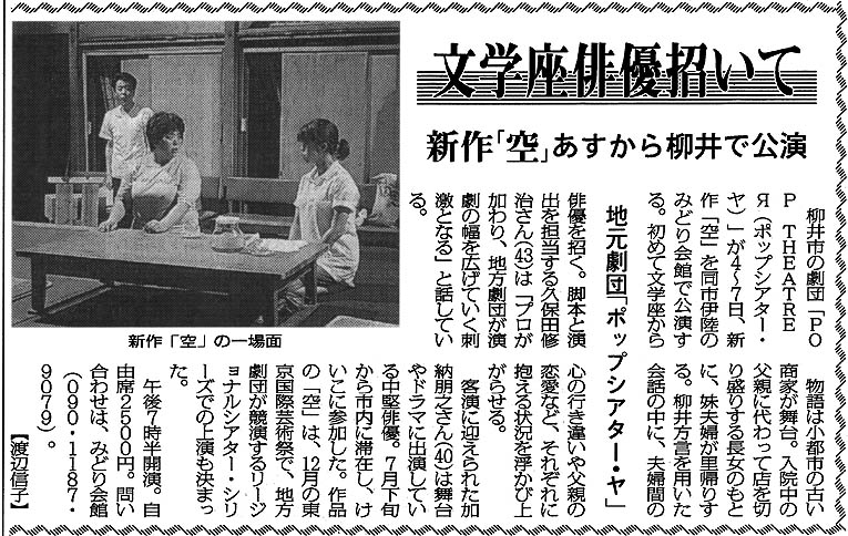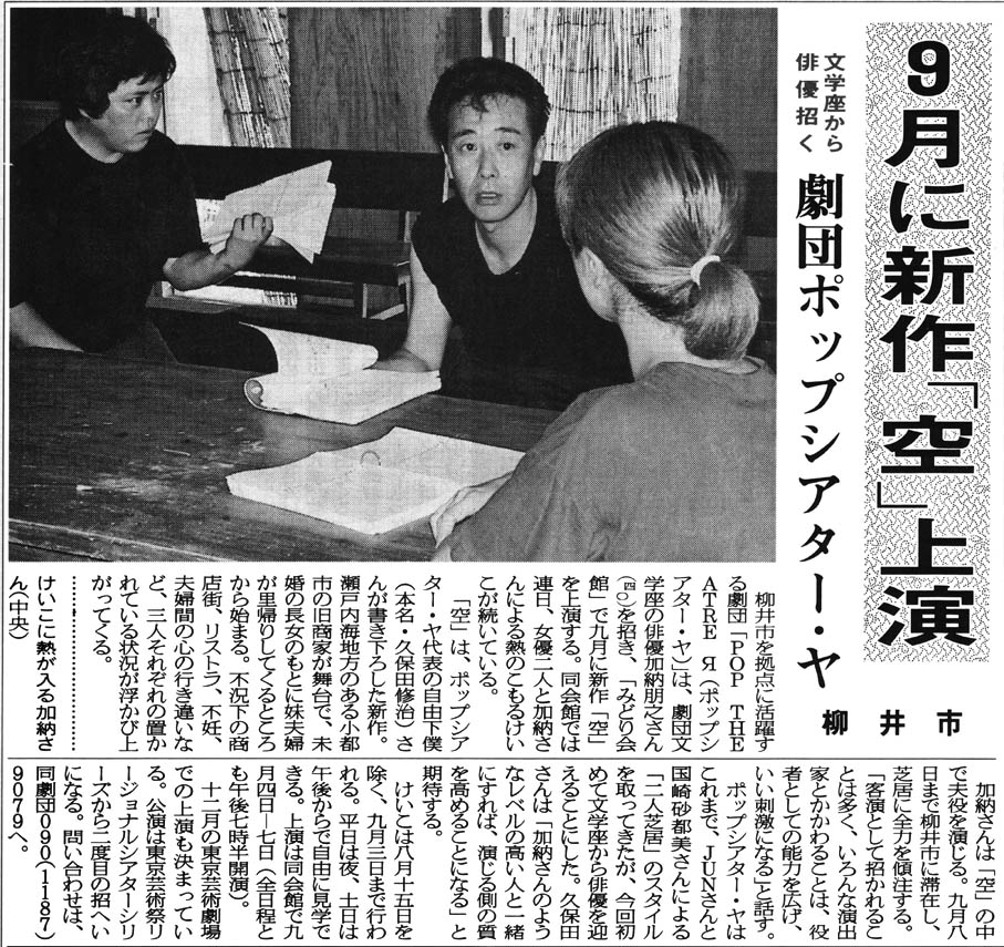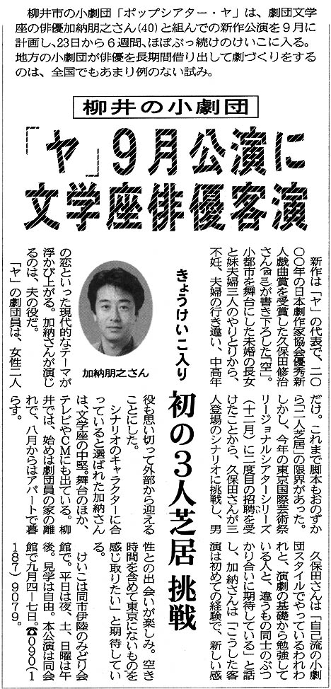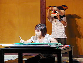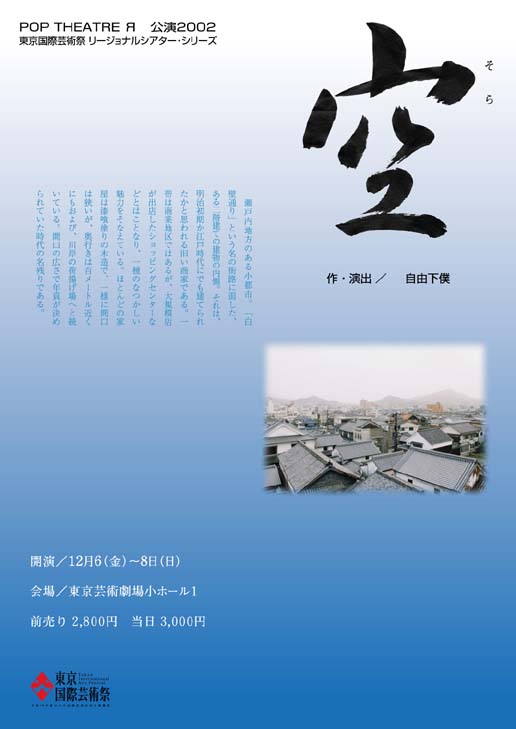 | 【上演データ】 2002年9月4日〜7日:みどり会館 2002年12月6日〜8日:東京芸術劇場小ホール1 作演出/自由下僕 出演(写真左から)/加納朋之〈文学座〉.国崎砂都美.JUN ![]() この戯曲は劇団で販売しています。(税込み1,000円) |