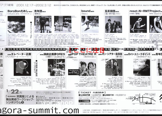 | この「冬のサミット2001」に参加したことで、後にIKACHI国際舞台芸術祭に参加することになるOrtやタテヨコ企画をはじめ、たくさんの劇団や東京の演劇人と知り合うことができました。 また、ウチの前に上演した鳥取の劇団「夢ORES」代表である森本孝文さんとは、2005年に「昏睡」で一緒に舞台を創ることになるのですから、不思議な縁を感じずにはいられません。